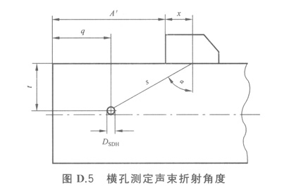 探頭折射角可通過(guò)滿足要求的橫孔最大回波來(lái)測(cè)定,也可在工件、參考試塊或者是在比例圖紙上直接測(cè)定,如圖D.2所示。