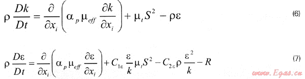 ,湍流動量擴散率ε=cDk3/2L,其中cD為無量綱的阻力系數(shù),L為特征長度。根據(jù)Navier-Stokes方程,可導出κ和ε方程: