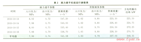 富胺液透平設計人口壓力為8.371 MPa,出口壓力為l.110 MPa,壓力差為7.261 MPa,設計流量為596 t/h,回收能量1 006 kW,主電機輸出功率為104kW。受上游原料氣壓力調(diào)低的影響,原料氣壓力由8.39 MPa下調(diào)至8.00 MPa,液力透平相關參數(shù)相應有所下降。2010年10月13-16日,第3聯(lián)合裝置進行100%負荷性能考核,液力透平運轉(zhuǎn)平穩(wěn),相關性能參數(shù)如表2所示。在原料氣100%負荷運行工況下,透平入口壓力平均值為7.99 MPa,出口壓力平均為0.74 MPa,壓力差平均為7.25 MPa,主電動機輸出功率平均值為248.31 kW,單臺液力透平回收能量為861.69 kW。通過優(yōu)化液力透平控制技術(shù),各系列裝置在正常運行期間均采用液力透平驅(qū)動模式,且裝置工藝運行無波動,透平外輸功率平穩(wěn)。