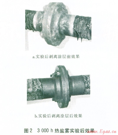 Enviropeel系統(tǒng)符合美國標(biāo)準(zhǔn)ASTMBll7《熱鹽霧實(shí)驗(yàn)》。圖2為在該標(biāo)準(zhǔn)下測試3 000 h之后的法蘭表面效果。實(shí)驗(yàn)表明,Enviropeel系統(tǒng)對其覆蓋范圍內(nèi)的金屬具有良好的防腐效果,而在沒有Enviropeel涂層保護(hù)的地方,如法蘭兩側(cè)連接處,則腐蝕非常嚴(yán)鶯。