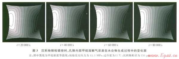 2)介觀尺度模型主要研究的是沉積物顆粒組成的孔隙,以孔隙水中溶解氣體的濃度為變量,模擬了由沉積物顆粒組成的單個(gè)孔隙內(nèi)水合物的生成過程。結(jié)果表明,在沉積物顆粒體系內(nèi)部,孔隙面相對比較平整,水合物先在沉積物壁面生成,而后沿著壁面法線方向增長,水合物在生成過程中呈層狀生成,最后在孔隙中間會合,從而充滿整個(gè)沉積物孔隙。