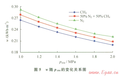 當進口天然氣壓力(P101)為5MPa、氣體制冷劑膨脹前壓力(P204)為5MPa、氣體制冷劑膨脹前預冷溫度(t206)為-30℃時,在一定范圍內(nèi)改變LNG儲存壓力(P104),通過HYSYS軟件模擬計算可得到產(chǎn)品LNG的單位能耗(w),進而得到叫隨P104的變化關系(圖5)。由圖5可知,產(chǎn)品LNG單位能耗隨LNG儲存壓力的增加而降低,這是因為儲存壓力越高,對應的液化溫度越高,所需的制冷量越少,因而能耗越低。然而儲存壓力的升高對儲存和輸運容器的耐壓要求也增高,增加了運輸成本[10]。取P104為2MPa作為最優(yōu)的LNG儲存壓力。