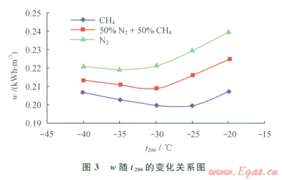 當進口天然氣壓力(P101)為5MPa、LNG儲存壓力(P104)為2MPa、氣體制冷劑膨脹前壓力(P204)為5MPa時,在一定范圍內(nèi)改變氣體制冷劑膨脹前預冷溫度(t206),通過HYSYS軟件模擬計算可得到產(chǎn)品LNG的單位能耗(w),進而得到w隨t206的變化關系(圖3)。由圖3可知,產(chǎn)品LNG單位能耗先隨制冷劑膨脹前預冷溫度的增加而降低,后又隨之增加而增加。這是因為膨脹前溫度較低時,流程的熱負荷較大,造成制冷劑流量上升,壓縮機功耗隨之增加,從而導致產(chǎn)品LNG能耗增加。膨脹前溫度較高時,膨脹后的溫度也較高,引起膨脹后壓力自調(diào)節(jié)降低壓力,壓縮機功耗隨之增加,從而導致產(chǎn)品LNG能耗增加。故而制冷劑存在一個最優(yōu)膨脹前壓力,南圖3可知,t206為-25℃、-30℃、-35℃時分別是CH4、50%N2+50%CH4、N2制冷劑的最優(yōu)膨脹前預冷溫度。