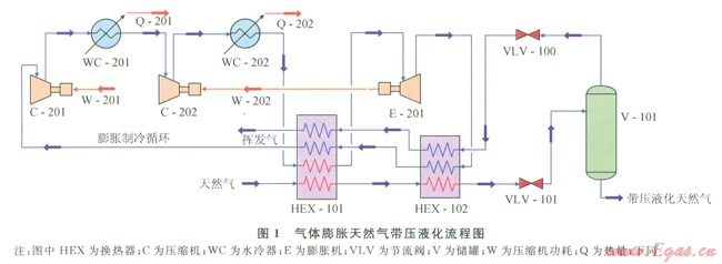 針對CO2含量較低的海上天然氣沒計了一種氣體膨脹帶壓液化流程(圖1)。為簡化研究,筆者省略了天然氣脫H2S、脫重烴、脫水等凈化處理過程。將凈化后帶有一定壓力的天然氣引入換熱器HEX-l01和HEX-l02降溫后節(jié)流至l~2MPa,變成液化產(chǎn)品LNG后引入儲罐V-101儲存。儲罐中的揮發(fā)氣(BOG)節(jié)流降溫后返同到換熱器,以回收部分低溫能和壓力能。整個液化流程由氣體膨脹制冷循環(huán)提供冷量,氣體制冷劑經(jīng)過兩級壓縮中間水冷后,再經(jīng)過換熱器HEX-l01預冷,然后經(jīng)過膨脹機膨脹降至低溫,依次為換熱器HEX-101和HEX-l02提供冷量,復溫后回到壓縮機。其中壓縮機C-202和膨脹機E-201共同構(gòu)成壓縮膨脹機組,膨脹機E-201產(chǎn)生的膨脹功剛好完全回收給壓縮機C-202使用。