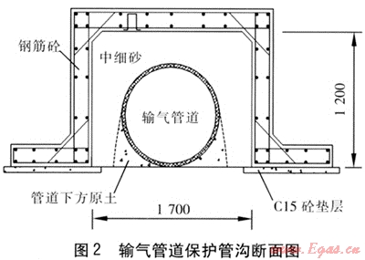 A號路為城市快速路,建設(shè)標(biāo)準(zhǔn)高,路面結(jié)構(gòu)厚度約80cm,路基需要分層碾壓以滿足道路密實度要求。考慮到輸氣管道設(shè)計壓力高,環(huán)向應(yīng)力大,為保證管道在道路施工及今后運(yùn)行中的安全,我們對A號路車行道下的輸氣管道采用管溝保護(hù)(見圖2,圖中尺寸單位為mm,以下同)。管溝內(nèi)壁與輸氣管道之間凈距不小于50cm,采用現(xiàn)澆施工,兩端伸出道路邊緣2m,并要求施工中盡量保留輸氣管道周圍的原土,避免破壞管道防腐層。