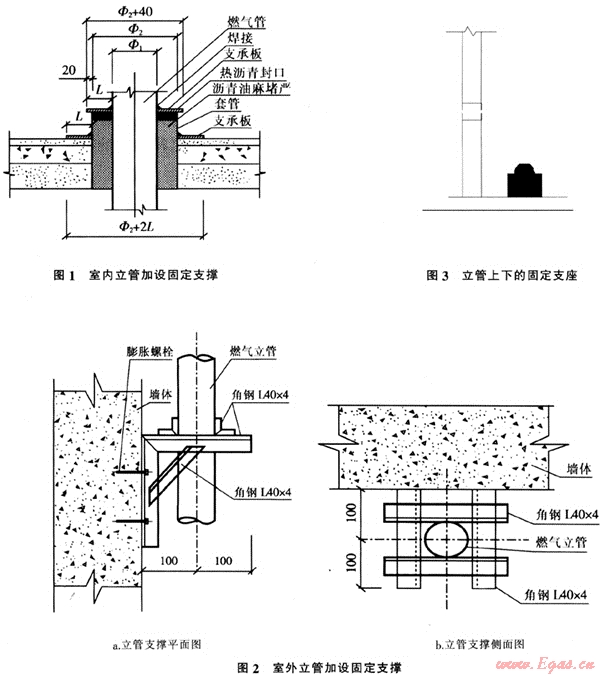 高層建筑物的樓層數(shù)較多,燃?xì)饬⒐艿拈L(zhǎng)度也較長(zhǎng),管道的自重較重,產(chǎn)生的壓應(yīng)力很大。為了使整個(gè)立管自重能均勻分?jǐn)?,?yīng)在建筑物中每隔一定的距離設(shè)置管道的固定支架,使固定支架與建筑物成為一體,以減少立管底部壓縮應(yīng)力過(guò)于集中,防止因管道下沉而引起引入管受力折斷或變形引起倒坡。一般固定立管的做法有: