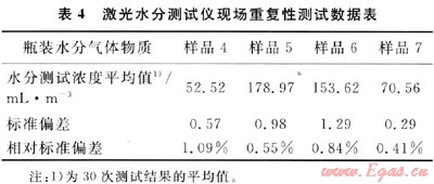 在A、B輸氣點(diǎn)站安裝SS2000激光水分測(cè)試儀,運(yùn)行6個(gè)月后,采用中國(guó)測(cè)試技術(shù)研究院制備的4瓶瓶裝水分氣體物質(zhì)(補(bǔ)充氣分別為氮?dú)夂图淄?,對(duì)儀器的重復(fù)性進(jìn)行了考察。實(shí)驗(yàn)結(jié)果見(jiàn)表4。