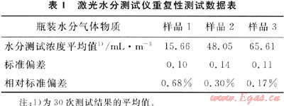 重復(fù)性是儀器的重要技術(shù)指標(biāo),直接影響分析結(jié)果的不確定度。在實(shí)驗(yàn)室對(duì)儀器的重復(fù)性進(jìn)行了考察。測(cè)試對(duì)象為中國(guó)測(cè)試技術(shù)研究院制備的3瓶瓶裝水分氣體物質(zhì)(補(bǔ)充氣為氮?dú)?,用SS2000激光水分測(cè)試儀對(duì)每瓶氣體進(jìn)行了連續(xù)1h的測(cè)試,測(cè)試結(jié)果見(jiàn)表1。