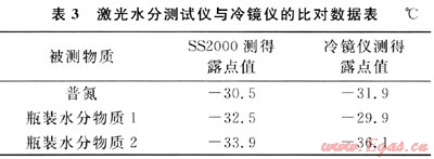天然氣水分測(cè)試常用的測(cè)試技術(shù)有冷鏡法、電解法、Al2O3電容法和石英晶體法等[5]。在實(shí)驗(yàn)室對(duì)SS2000激光水分測(cè)試法與冷鏡法進(jìn)行了比對(duì)(冷鏡儀由中國(guó)測(cè)試技術(shù)研究院進(jìn)行檢定),被測(cè)物質(zhì)分別為普氮和瓶裝水分物質(zhì)(補(bǔ)充氣為甲烷),濃度值與露點(diǎn)值之間的轉(zhuǎn)換采用ASTM1142標(biāo)準(zhǔn),比對(duì)結(jié)果見(jiàn)表3。