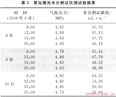 SS2 000激光水分測(cè)試儀在某輸氣站運(yùn)行了4個(gè)月,對(duì)站場(chǎng)進(jìn)氣進(jìn)行實(shí)時(shí)監(jiān)測(cè),于每天8:00、12:O0、16:00和20:O0分別記錄儀器的測(cè)試數(shù)據(jù),2008年6月8~10日的測(cè)試結(jié)果見(jiàn)表2。