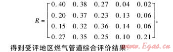 其次,綜合考慮影響管道失效的所有因素進(jìn)行二級模糊綜合評判確定管段的風(fēng)險(xiǎn)等級,根據(jù)對各因素的等級計(jì)算得出模糊綜合評價(jià)集合R: