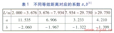 不同等效距離對應(yīng)的系數(shù)a、b見表l[5]。