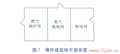 2012年6月某燃?xì)鉄犭姀S發(fā)生爆炸,造成兩死一傷。爆炸地點(diǎn)位于燃?xì)怆姀S內(nèi)的一座附屬建筑物(現(xiàn)澆框架式結(jié)構(gòu))內(nèi),爆炸建筑物平面布置見圖1。監(jiān)控錄像顯示,爆炸發(fā)生前有兩名人員先后進(jìn)入配電間,2min后發(fā)生爆炸,爆炸沖擊波半徑超過30m。約l5min后消防及救援人員趕到現(xiàn)場,使用消火栓撲滅零星明火。事故現(xiàn)場勘察顯示,配電間3面外墻向外坍塌,建筑物內(nèi)2面隔墻均向燃?xì)忮仩t房方向垮塌。配電間內(nèi)有兩排配電柜,無超大型變壓器設(shè)備,多個(gè)配電柜門被炸飛,配電柜內(nèi)有燒結(jié)痕跡。氮?dú)馄?、氮?dú)鈪R流管及安全放散管(放散口設(shè)置在室內(nèi))傾倒在燃?xì)忮仩t房與氮?dú)馄拷M間之間的隔墻一側(cè),放散口有積碳現(xiàn)象,放散口上方墻體有噴射火焰燃燒過的痕跡。
