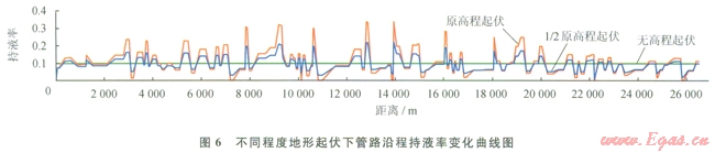 模擬計算得到不同程度地形起伏下凝析氣管道內(nèi)持液率的沿線分布曲線如圖6所示。從圖6可以看出,在無地形起伏的條件下,管路沿程持液率基本保持不變,平均持液率為0.1;而存在地形起伏的情況下(對照圖6和圖3),管內(nèi)持液率隨沿線地形起伏的變化出現(xiàn)了不同幅度的波動,且地形起伏高度越大,持液率波動的幅度也越大,在上坡管段內(nèi)持液率相對較大,下坡管段內(nèi)持液率相對偏小。分析這種地形高差對持液率影響較大的原因是:上升管段內(nèi)流體在爬坡過程中壓降損失比較嚴(yán)重,管內(nèi)壓力下降相對較快,氣相體積膨脹,使得氣相流速加快,攜液能力增強,致使持液率隨地形高差的增加而增大;反之亦然。