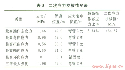 1)在試壓工況下的一次應(yīng)力和綜合應(yīng)力校核中,最大應(yīng)力產(chǎn)生的位置都在管道的彎管3處,產(chǎn)生最大二次應(yīng)力的位置在管道的彎管2處,說明彎管是應(yīng)力危險截面處。