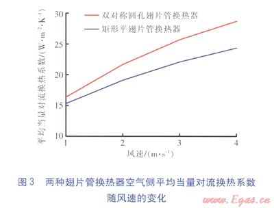 對稱圓孔翅片管具有優(yōu)越的強化傳熱效果。風速范圍為l~4m/s時,與矩形平翅片管換熱器相比,對稱圓孔翅片管換熱器的換熱量平均提高了12.8%,空氣壓力降提高并不明顯。