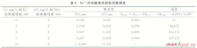 由表5結果表明:不加Fe3+時,NO3-標準液因不含有機物,在275nm處幾乎無吸收,加入Fe3+標準液后,溶液在210nm、275nm處吸光度明顯提高,這說明Fe3+在210nm、275nm處均有強烈吸收,對NO3-的測定結果影響較大,能使測定結果大大增加。