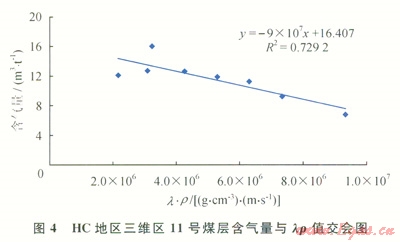 煤層含氣性預(yù)測的基礎(chǔ)是測井曲線分析。通過對研究區(qū)內(nèi)所收集到的井的含氣量與彈性參數(shù)交會分析(圖4)得到,該區(qū)11號煤層的含氣量隨密度、縱波速度、縱橫波速度比、lr值增大而減小,同時按線性關(guān)系擬合儲層含氣量與lr值之間的數(shù)學(xué)關(guān)系,相關(guān)系數(shù)為0.7292,認(rèn)為兩者的線性關(guān)系有一定的可靠性,可以用lr值來指示含氣量的變化,lr小值對應(yīng)含氣量的大值。