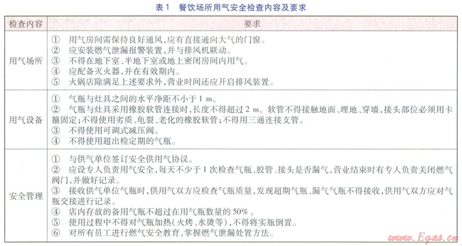 自2012年11月山西壽陽(yáng)火鍋店發(fā)生燃?xì)獗ㄊ鹿屎?,武漢市立即開(kāi)展對(duì)餐飲場(chǎng)所的用氣安全檢查。按武漢市出臺(tái)的《商用燃?xì)庠罹咴O(shè)施安裝及驗(yàn)收技術(shù)規(guī)程》(以下簡(jiǎn)稱《規(guī)程》)的規(guī)定,使用管道氣的餐飲場(chǎng)所在通氣前須進(jìn)行驗(yàn)收,且管道氣供氣單位須定期上門對(duì)用氣場(chǎng)所進(jìn)行安全檢查。因此,此次用氣安全檢查的重點(diǎn)是使用瓶裝氣的餐飲場(chǎng)所。根據(jù)GB 50028—2006《城鎮(zhèn)燃?xì)庠O(shè)計(jì)規(guī)范》、CJJ 94—2009《城鎮(zhèn)燃?xì)馐覂?nèi)工程施工與質(zhì)量驗(yàn)收規(guī)范》、《規(guī)程》等對(duì)瓶裝氣用氣場(chǎng)所提出的安全要求,制定了餐飲場(chǎng)所用氣安全檢查的內(nèi)容及要求(見(jiàn)表l)。