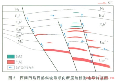 裂陷期同沉積斷裂為油氣垂向運移的良好通道。西湖凹陷裂陷階段,張性正斷層發(fā)育,斷層大都具有開啟性,且這一階段發(fā)育的正斷層一般都斷穿下部主要烴源層,成為油氣運移主要的通道。如平湖斜坡帶油氣源主要為平湖組及其以下地層,決定了斷層為主要油氣通道,并形成與斷層有關(guān)的構(gòu)造型油氣藏。由于斷層具有良好的垂向輸導(dǎo)能力,??尚纬删酂N源層有較大時空跨度的含油氣層位,在斷層帶附近可以形成多層疊置的油氣藏。其次,斜坡帶上不整合面為油氣的次主要運移通道,可以使油氣進行長距離的側(cè)向和斜向運移[5],裂陷期斷裂與不整合面構(gòu)成了網(wǎng)狀的油氣輸導(dǎo)體系(圖5)。