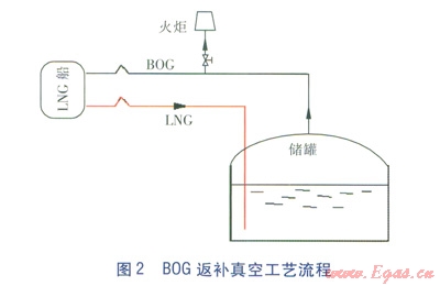 LNG船在向儲罐卸裝液體時,由于液體流出而產(chǎn)生真空,增加了液體卸裝的阻力,極大地增加了耗能,甚至使LNG船上的液體無法完全卸入罐內(nèi)。因此,LNG接收站接收LNG時,需要及時填補LNG船艙由于液體流出所形成的真空。如采用其他氣體返補真空,既會引入新的雜質(zhì),又會造成熱量大量流入,加速LNG氣化。而LNG儲罐中產(chǎn)生的BOG溫度大約在-140~150℃,將BOG通過氣體返回線流回船艙填補真空,可以很好地避免上述問題。同時在BOG返回船艙時,船艙內(nèi)大量LNG提供的冷量使得BOG重新液化,在一定程度上回收了BOG[7]。BOG返補真空工藝流程見圖2。