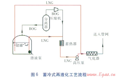 為了克服LNG夜間外輸量小導(dǎo)致所提供的冷量不足以將BOG再液化的問題,在以上基礎(chǔ)上發(fā)展了蓄冷式再液化工藝,流程見圖6。
