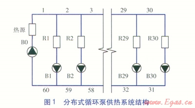 某供熱系統(tǒng)共有30座熱力站,供、回水設(shè)計(jì)溫度為l30、70℃,各熱力站設(shè)計(jì)熱負(fù)荷均為3MW,水頭損失均為10m,各熱力站所在支管長度為400m,支管水頭損失為4.38m,熱源內(nèi)部水頭損失為15m。分布式循環(huán)泵供熱系統(tǒng)結(jié)構(gòu)見圖1,圖中R1~R30為熱力站編號,1~60為干管管段編號,80為熱源循環(huán)泵編號,81~B30為分布式循環(huán)泵編號。若取消分布式循環(huán)泵,則分布式循環(huán)泵供熱系統(tǒng)則變成傳統(tǒng)供熱系統(tǒng)。各干管管段計(jì)算參數(shù)見表1,各干管管段長度均為100m。各熱力站所在支管的比摩阻均為42.1Pa/m,供熱系統(tǒng)中所有水泵的效率均按0.7計(jì)算。