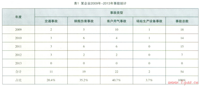 搞好安全管理的前提是進行風險分析。根據(jù)企業(yè)的具體特點,對全企業(yè)進行全面而系統(tǒng)的安全風險分析,按照現(xiàn)代系統(tǒng)安全工程的觀點,安全生產(chǎn)工作是為了使生產(chǎn)過程符合物質(zhì)條件和工作秩序,防止發(fā)生人身傷亡和財產(chǎn)損失的活動,安全牛產(chǎn)工作的主要目標是使系統(tǒng)中的人員免遭不可承受風險的傷害。安全管理工作實際上就是風險管理工作。各崗位的危險程度用危險度來表示,它是由事故發(fā)生的可能性和事故后果的嚴重性決定的。經(jīng)過對國有瓶裝氣企業(yè)進行安全風險陛分析,我們得出最常見的安全風險主要有交通安全風險、鋼瓶傷害風險、場站安全風險、客戶用氣事故風險等等,這與國有瓶裝氣企業(yè)歷年安全事故統(tǒng)計相吻合,某企業(yè)2009年~2013年事故統(tǒng)計見表1。