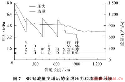 SB站流量突增后的全線壓力和流量曲線圖如圖7所示。從圖7可以看出,當(dāng)SB站的氣量突然增加后,SB站的出站壓力迅速上升,其他站的壓力和流量變化幅度不大。