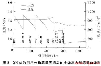 XN站的用戶分輸流量突增后的全線壓力和流量曲線圖如圖8所示。從圖8可以看出,當(dāng)XN站的分輸氣量突然增加后,XN站上下游的壓力會(huì)有所下降,上游的流量會(huì)有所增加。