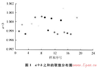借助MATLAB軟件對多組Q、K、L值進(jìn)行擬合,記錄擬合結(jié)果,并得出口+6之和的取值分布圖(圖1)。發(fā)現(xiàn)a+b之和在0.99~1.001之間,約等于1,即規(guī)模報酬不變。
