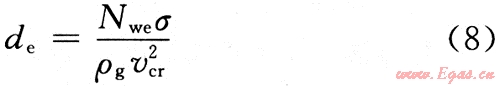橢球體液滴韋伯數(shù)的臨界值為20~30。當氣體流速大到足以使韋伯數(shù)達到臨界值時,速度壓力起主要作用,液滴就容易破壞。取韋伯數(shù)為Nwe=30回代到式(7),解出最大液滴的直徑(de),即