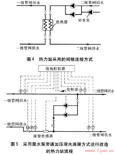 恒源熱力公司自2009年8月開始,對(duì)東北線熱網(wǎng)進(jìn)行混水連接、遠(yuǎn)程監(jiān)控技術(shù)改造。已將49座熱力站進(jìn)行整合改造成混水連接熱力站30座,建設(shè)監(jiān)控中心,對(duì)熱力首站和熱力站實(shí)施監(jiān)控。改造項(xiàng)目包括將原有熱力站水-水換熱器、補(bǔ)水泵等設(shè)備拆除,進(jìn)行站內(nèi)管道的改造,安裝自動(dòng)調(diào)節(jié)閥、現(xiàn)場(chǎng)控制器。2009年11月10日,所有改造工作全部完成,至11月30日全部調(diào)試完畢,正式投入運(yùn)行。改造主要考慮采用混水泵旁通加壓、混水泵供水加壓兩種連接方式。