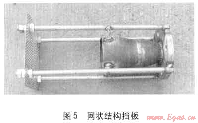 該增壓系統(tǒng)試運(yùn)行時(shí)噪聲較大,主要出現(xiàn)在儲(chǔ)氣罐處。由于現(xiàn)場(chǎng)壓縮機(jī)進(jìn)出口都采用軟管連接,并且噪聲是在增壓的高壓階段出現(xiàn),因此不是振動(dòng)引起。我們對(duì)此進(jìn)行了分析,噪聲可能是由以下原因造成:進(jìn)入儲(chǔ)氣罐的氣流速度過(guò)快,產(chǎn)生了噪聲(聽(tīng)起來(lái)類似口哨聲),同時(shí)儲(chǔ)氣罐的體積較大且罐壁薄,對(duì)噪聲進(jìn)行了放大。如果能夠分散進(jìn)入儲(chǔ)氣罐的氣流,噪聲可能會(huì)相應(yīng)降低。于是制作了網(wǎng)狀結(jié)構(gòu)的擋板(見(jiàn)圖5)裝于儲(chǔ)氣罐內(nèi)部進(jìn)氣口處。安裝完成后,經(jīng)過(guò)實(shí)際使用驗(yàn)證,整體噪聲大大降低。