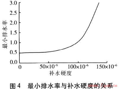 對蒸發(fā)冷卻系統(tǒng)而言,由于水不斷蒸發(fā),溶于水中的礦物質會析出并沉積在濕簾表面上形成水垢。濕簾表面大量的水垢會影響濕簾的蒸發(fā)冷卻效率和使用壽命。目前,在燃氣輪機進氣冷卻系統(tǒng)中,一般針對不同的補水硬度(以CaC03計,質量分數(shù))通過控制排水率(即排水質量與蒸發(fā)水質量之比)的方法來抑制水垢的產(chǎn)生。最小排水率通常采用圖4的曲線來確定[3]。