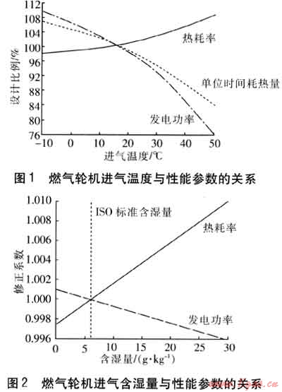 PG6111FA型燃氣輪機發(fā)電機組的標準工況(額定工況)為:環(huán)境溫度為15℃,大氣絕對壓力為97.8kPa、相對濕度為48%(即含濕量為5.25g/kg)。在標準工況下,該燃氣輪機發(fā)電功率為73640kW,單位時間耗熱量為750.4×106kJ/h,熱耗率(指每生產(chǎn)1kW·h電所消耗的熱量)為10190kJ/(kW·h),排氣質量流量為735.3×103kg/h,排氣溫度為600.6℃,燃料是天然氣。在非標準工況下(環(huán)境相對濕度為48%,大氣絕對壓力為97.8kPa),燃氣輪機進氣溫度與性能參數(shù)的關系見圖1,圖1中設計比例是指燃氣輪機非標準工況下的性能參數(shù)與標準工況下的性能參數(shù)之比。在環(huán)境溫度為15℃、大氣壓力為97.8kPa時,燃氣輪機空氣進氣含濕量與性能參數(shù)的關系見圖2,圖2中含濕量是每1kg干空氣中含有水的質量,修正系數(shù)是指非IS0標準空氣進氣含濕量時燃氣輪機的性能參數(shù)與IS0標準空氣進氣含濕量下燃氣輪機的性能參數(shù)之比。
