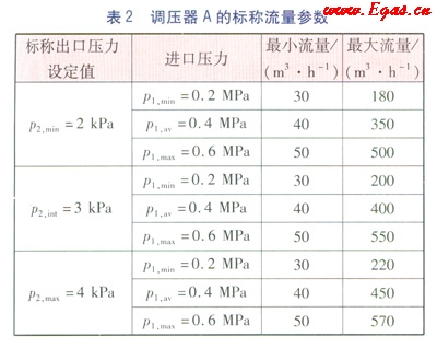 以一款直接作用式調(diào)壓器A為例,該調(diào)壓器的進(jìn)口壓力范圍為dp1=0.2~0.6MPa(即p1,min=0.2MPa,p1,max=0.6MPa),出口壓力范圍dp2=2~4kPa(即p2,min=2kPa,p2,max=4kPa)。其標(biāo)稱穩(wěn)壓精度等級Ac=10,標(biāo)稱關(guān)閉壓力等級Sg=20,標(biāo)稱關(guān)閉壓力區(qū)等級Sz=20,標(biāo)稱靜特性曲線族的關(guān)閉壓力區(qū)等級Sz,p=20。相應(yīng)的標(biāo)稱流量參數(shù)見表2。