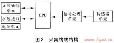 采集終端包括傳感器單元、信號(hào)處理單元、系統(tǒng)控制(CPU)單元、無線通信單元和電源單元等。采集終端結(jié)構(gòu)見圖2。