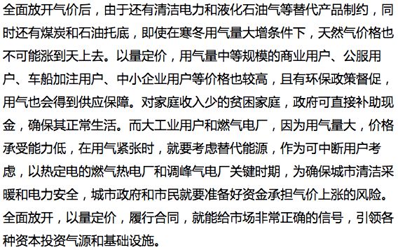 全面放開,以量定價(jià)。任何商品都是零售價(jià)格高,批發(fā)價(jià)格低,買的越多就應(yīng)該折扣越多,價(jià)格越便宜。天然氣價(jià)格改革全面放開,以量定價(jià)也應(yīng)該符合基本市場原則,也符合壓力和壓強(qiáng)的關(guān)系,天然氣大工業(yè)用戶或大型燃?xì)怆姀S由于用氣量大,同等天然氣價(jià)格波動(dòng)產(chǎn)生的壓力對其成本和贏利能力形成的壓強(qiáng)巨大,需求彈性大;而居民用氣量小,用戶多且分散,同等天然氣價(jià)格波動(dòng)產(chǎn)生的壓力對其使用形成的壓強(qiáng)較小,需求彈性小。燃?xì)夤?yīng)商在滿足居民、商業(yè)、公服、車船加注等眾多分散用戶,要投入更多人力、物力和財(cái)力,其成本要遠(yuǎn)遠(yuǎn)大于穩(wěn)定生產(chǎn)的大工業(yè)用戶或燃?xì)怆姀S。按照以量定價(jià)原則,居民用氣應(yīng)該價(jià)格最高,而目前價(jià)格體系正好相反,這就是冬天燃?xì)馍虨楂@得利潤,優(yōu)先滿足高價(jià)用戶需求,造成居民用氣氣荒的根本原因。