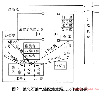 ② 消防作業(yè)組人員立即啟動(dòng)消防水系統(tǒng),對所有儲(chǔ)罐進(jìn)行持續(xù)冷卻,同時(shí)用大量的噴霧水流驅(qū)散站內(nèi)的液化石油氣蒸氣云。