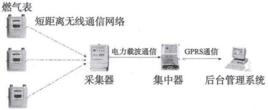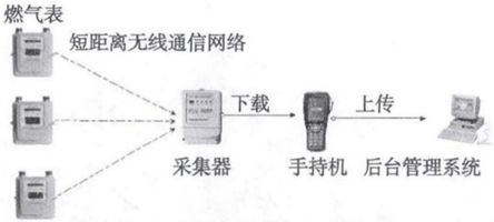 無線燃?xì)獗硗ㄟ^自身攜帶的無線通信模塊與采集器實(shí)現(xiàn)無線通信,采集器定期主動采集燃?xì)獗淼臄?shù)據(jù)并儲存,工作人員通過手持機(jī)與采集器通信將表中的數(shù)據(jù)下載到手持機(jī)中。此種抄表系統(tǒng)中的通信方式均為短距離通訊網(wǎng)絡(luò)。該技術(shù)僅僅將有線抄表技術(shù)更換成無線通訊,依然需要工作人員定期將數(shù)據(jù)下載到手持機(jī)中,比較落后。