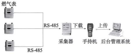 有線抄表系統(tǒng)主要由燃?xì)獗?、采集器和手持機(jī)構(gòu)成,其原理如圖2所示。燃?xì)獗硗ㄟ^通信總線與采集器相連,采集器定期采集燃?xì)獗頂?shù)據(jù)并存儲于芯片中。工作人員通過手持機(jī)讀取采集器中所存儲的燃?xì)獗頂?shù)據(jù)并將其上傳到燃?xì)馄髽I(yè)后臺管理系統(tǒng)。