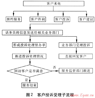 在“確認客戶辦理類型”步驟中,我們又可以根據(jù)客戶辦理的類型劃分出以下子流程,用以指導話務員按照詳細的作業(yè)指南進行操作。即:預約服務受理子流程、客戶咨詢受理子流程、客戶投訴受理子流程、客戶建議處理子流程。以客戶投訴受理子流程為例,我們可以繪制出相應的流程圖(見圖2)。