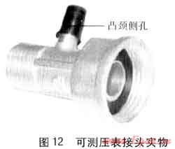 如圖12所示,可測壓表接頭是安裝于燃氣計量表進出口端的產(chǎn)品。在普通表接頭的基礎(chǔ)上研制出可測壓表接頭,可測壓表接頭上帶有一個具有凸頸的側(cè)孔,能夠方便地將測壓儀表通過凸頸安裝在表接頭上。通常情況下該側(cè)孔采用密封圈、螺釘及防護套堵住,保證管道密封性。當(dāng)需要測壓時,去掉密封圈、螺釘及防護套,打開側(cè)孔,安裝上測壓儀表即可測量壓力。測完之后,拆下測壓儀表,再采用密封圈、螺釘及防護套將側(cè)孔堵住,保證普通表接頭原有功能。