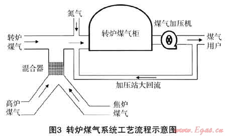 (2) 利用轉(zhuǎn)爐煤氣柜、煤氣加壓站、合成轉(zhuǎn)氣混合站等設(shè)施,在實際生產(chǎn)過程中町以實現(xiàn)焦?fàn)t煤氣和氮氣之間的定量、均勻混合,合成后的混合氣可以通過加壓站供給用戶使用。
