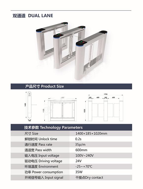 適用于對(duì)通道寬要求比較大的場(chǎng)合,包括攜帶行李包裹的行人或自行車(chē)較多的場(chǎng)合,以及行動(dòng)不便者專用通道。還適用于對(duì)美觀度要求較高的場(chǎng)合。