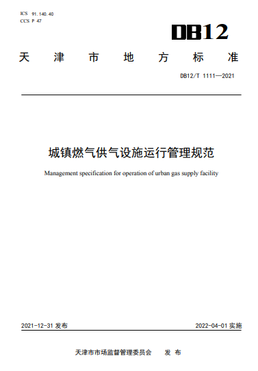 城鎮(zhèn)燃?xì)夤庠O(shè)施運(yùn)行管理規(guī)范DB12/T 1111—2021:本文件規(guī)定了城鎮(zhèn)燃?xì)夤艿琅c調(diào)壓設(shè)施,天然氣門(mén)站、儲(chǔ)配站、計(jì)量站設(shè)施,壓縮天然氣設(shè)施,液 化石油氣設(shè)施,液化天然氣設(shè)施,監(jiān)控與數(shù)據(jù)采集系統(tǒng)運(yùn)行管理的基本要求。 本文件適用于天津市城鎮(zhèn)燃?xì)夤庠O(shè)施從投產(chǎn)至報(bào)廢期間的運(yùn)行管理和評(píng)價(jià)。 本文件不適用于上述供氣設(shè)施的維護(hù)、搶修和各類(lèi)用戶(hù)燃具與用氣設(shè)備的管理,以及農(nóng)村天然氣供 氣設(shè)施的運(yùn)行管理。