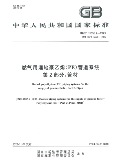 燃?xì)庥寐竦?a href=http://m.tywl001.com/e/tags/?tagname=%E8%81%9A%E4%B9%99%E7%83%AF target=_blank class=infotextkey>聚乙烯(PE)管道系統(tǒng) 第2部分:管材GB/T 15558.2-2023